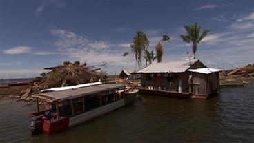Täglich holt jedes Holzfällerteam zehn bis 15 Regenwaldgiganten aus dem Wasser - darunter kostbare Exoten wie Purple Heart, Andira, Basralocus oder Ipé. Die frisch gefällten, tonnenschweren Bäume befestigen die Männer an einem Ponton, der dann von einem Schlepper zu einem Sägewerk gebracht wird.